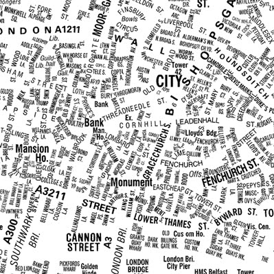 From a typographer's point of view, this is an incredable image! Micro type being used as a replacement for lines to show roads?...genius! I'm suprised it hasn't been thought of before. A beautiful typographic way to represent a city.
